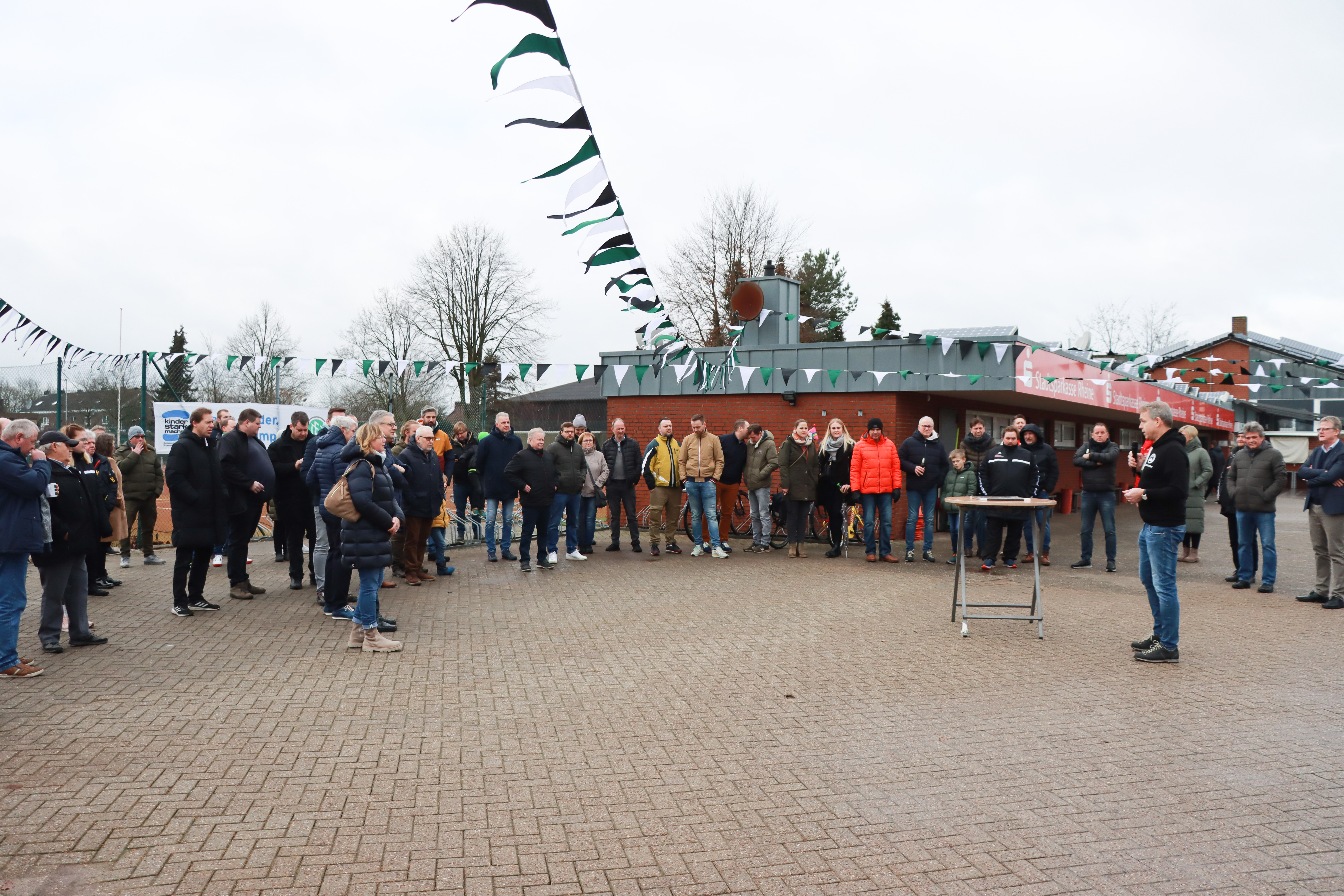 Als die Verantwortlichen von Grün-Weiß Amisia Rheine am Sonntagmorgen ihren Blick gen Himmel richteten, war die Stimmung im Vorfeld der Einweihungsfeierlichkeiten getrübt. Temperaturen nur knapp über dem Gefrierpunkt und Dauerregen - kein Traumwetter für ein solches Ereignis. Doch bis zum offiziellen Beginn der Veranstaltung regnete es sich aus und unser Vorsitzender, Klaus Bönninghoff, konnte pünktlich um 13.30 Uhr rund 100 Gäste vor dem Kunstrasenplatz im Auto-Deters-Stadion begrüßen.