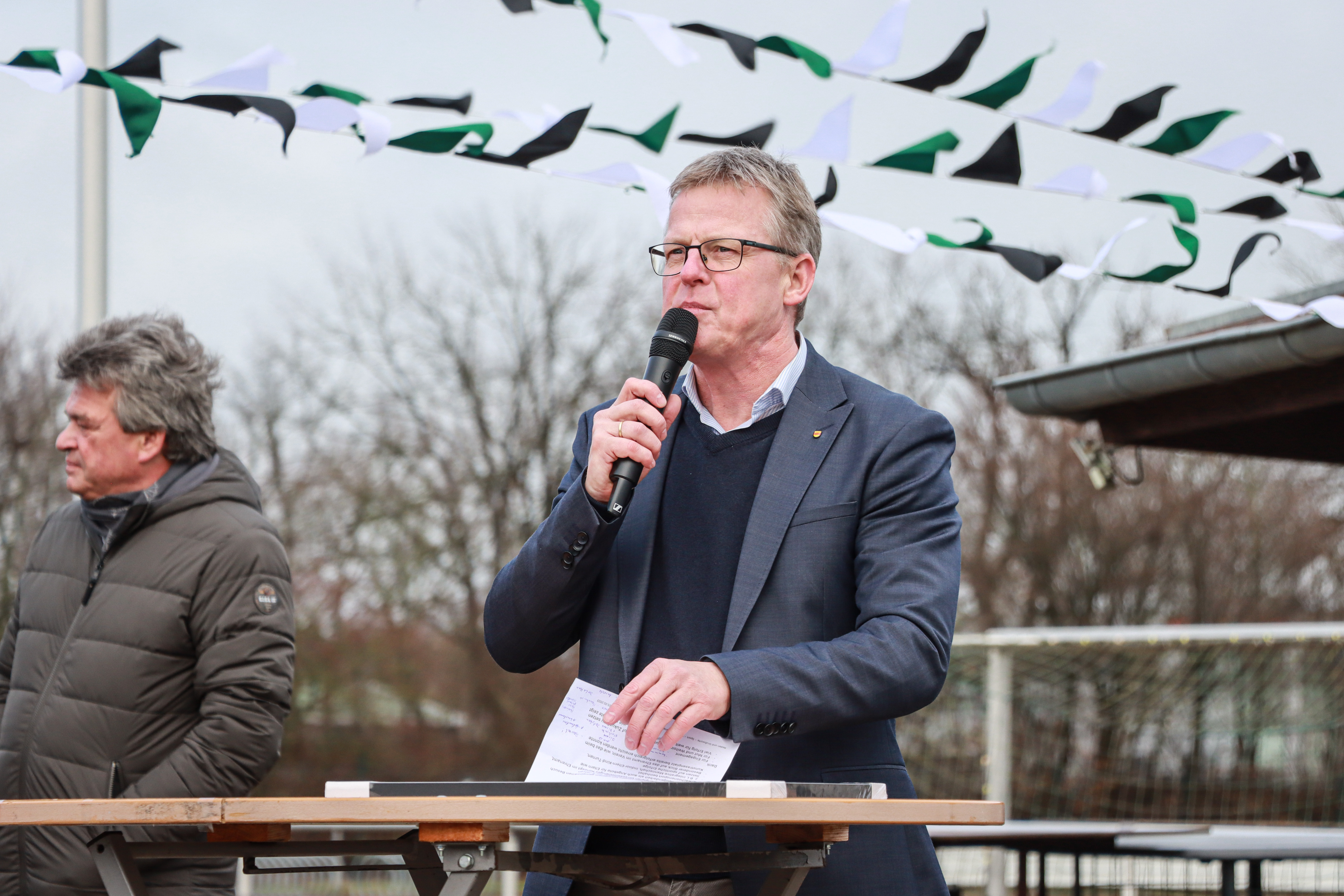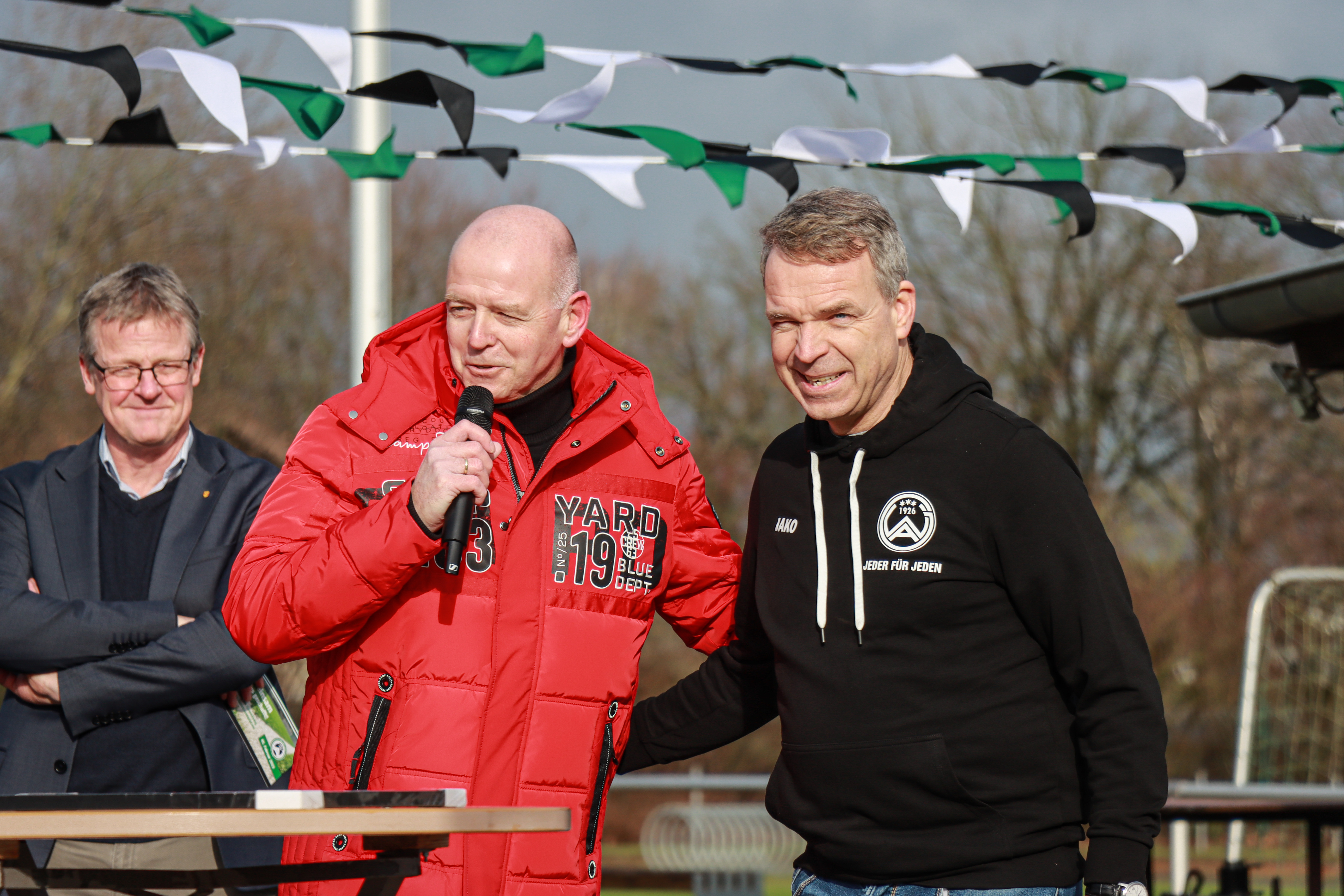 "Wir hätten uns natürlich etwas mehr Sonne gewünscht, auf der anderen Seite könnte das Wetter nicht besser sein, um auf die Notwendigkeit eines Kunstrasenplatzes hinzuweisen. Hätten wir diesen Kunstrasenplatz hier nicht, dann hätten wir hier vermutlich heute – in der Emsaue damals ganz sicher – einen verwaisten Sportplatz und einen Spielausfall zu beklagen, denn nach den Regenfällen der letzten Tage und Wochen wäre ein Spiel auf Naturrasen nur schwer durchführbar.", begann Bönninghoff seine Rede.